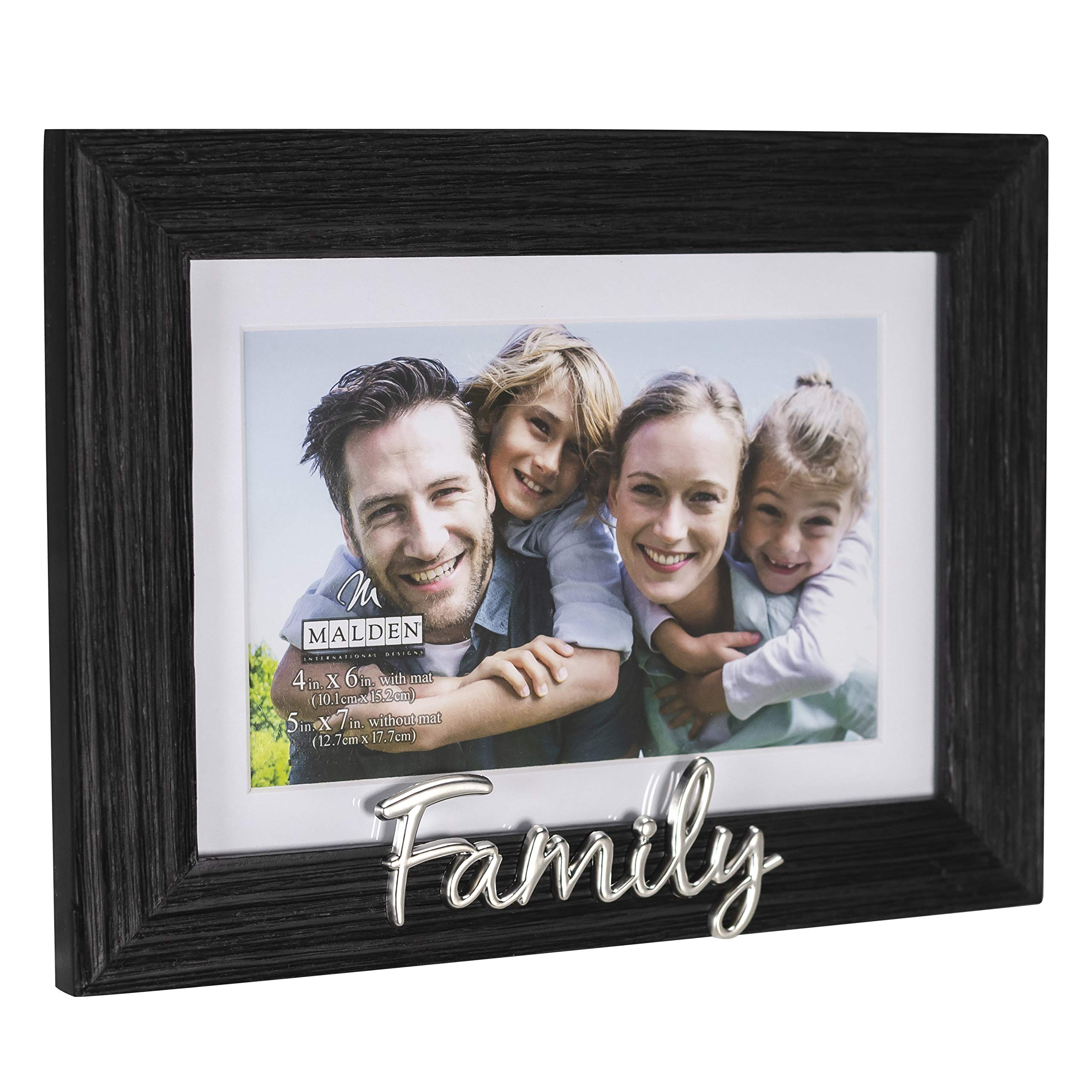 - CONTEMPORARY DESIGN: Frame holds (1) 4” x 6” horizontal Photo with the included white beveled mat or one 5” x 7” horizontal photo without the mat and features a silver finish “Family” word attachment in a stylish script font. Black, high quality MDF wood with a textured wood grain finish.