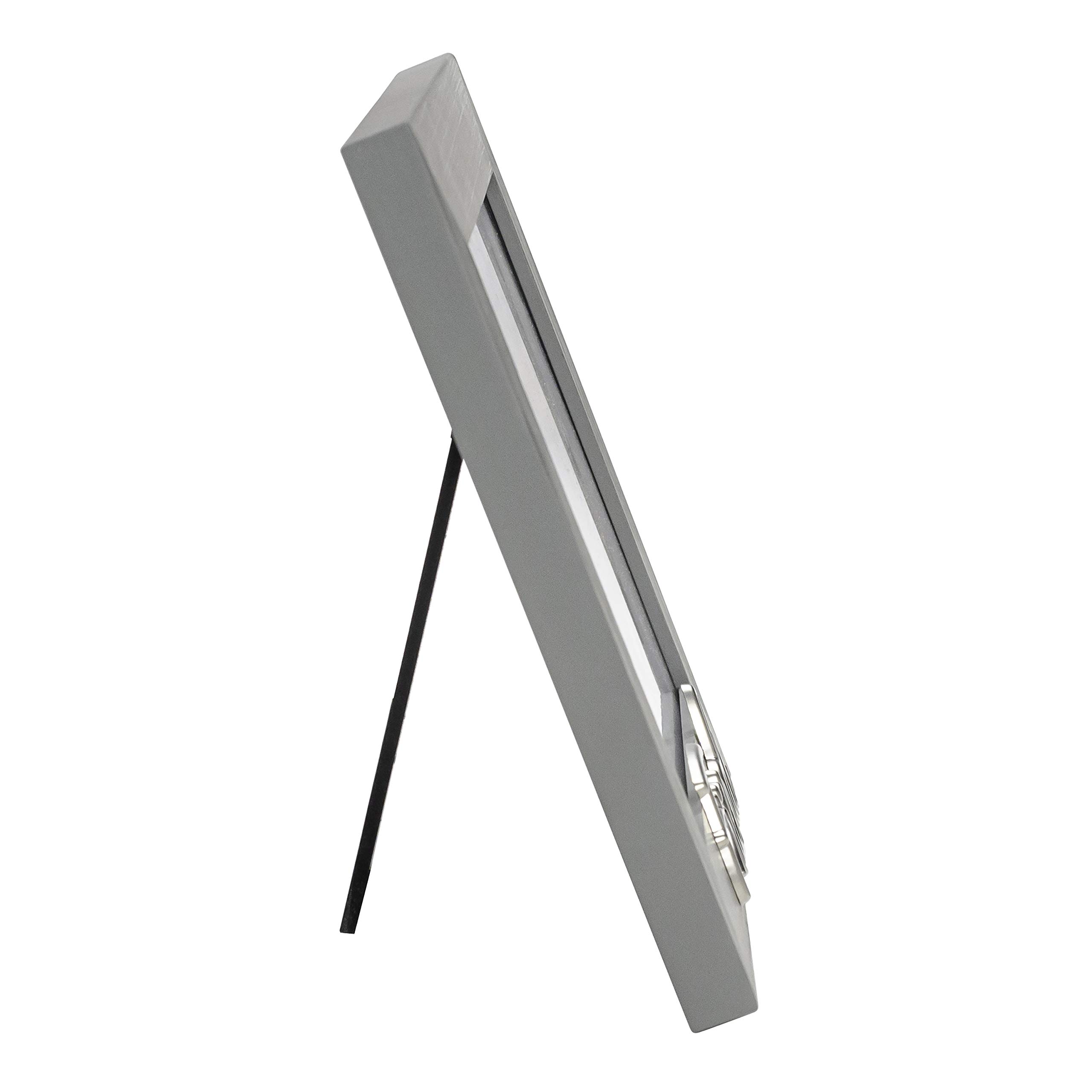 - PREMIUM QUALITY MATERIALS: This photo frame is constructed of gray, high quality MDF wood with a textured wood grain surface. Freestanding, easel backed picture frame. Change photos easily with swing tab closures. Attached hardware makes wall hanging easy. Durable glass front will protect and showcase your precious photos.