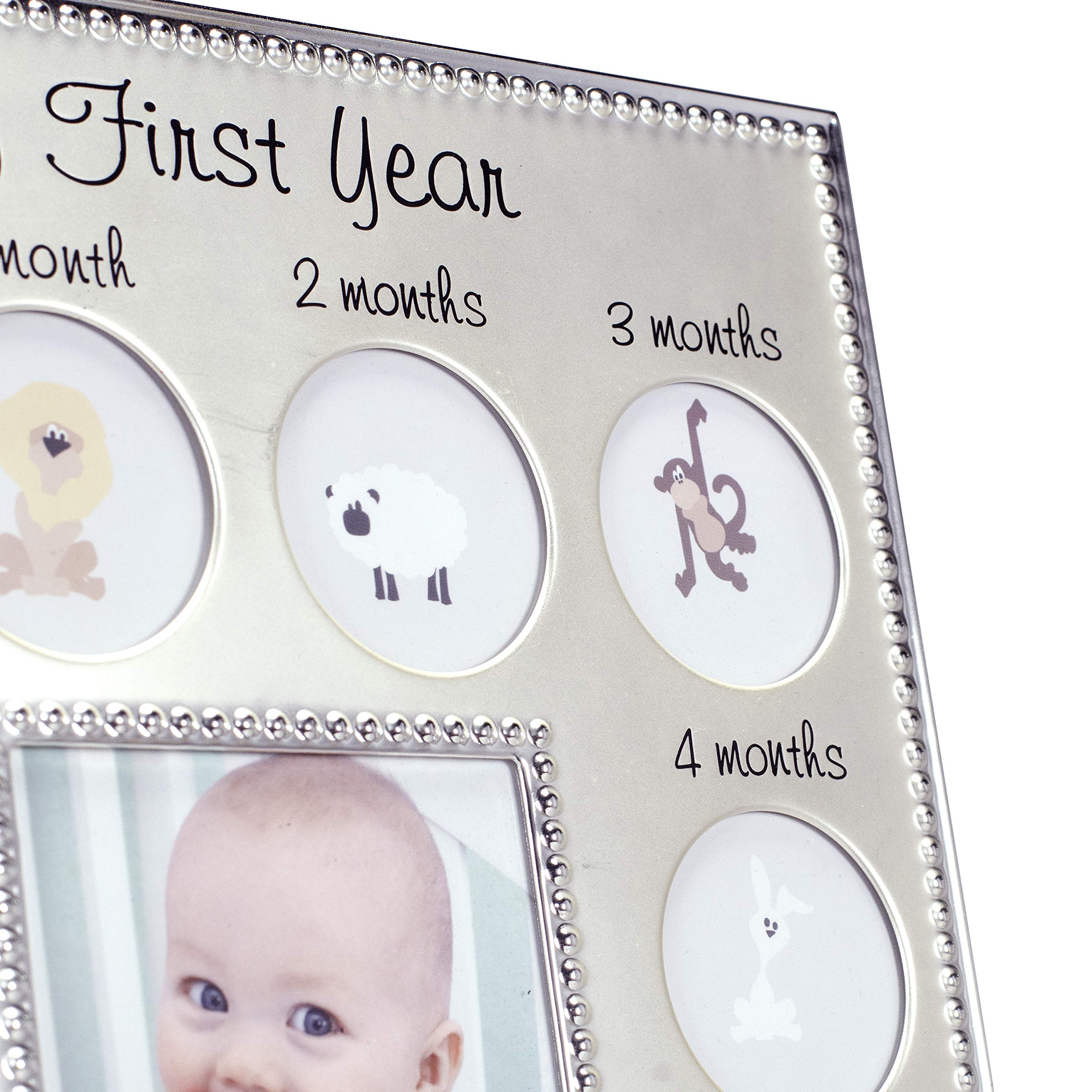 - ALLURING LOOK: Two tone silver finish; Screen-printed sentiment; My First Year; Looks Who’s One; Holds one vertical 3.5" x 4" photo and twelve 1.6" x 1.6" photos